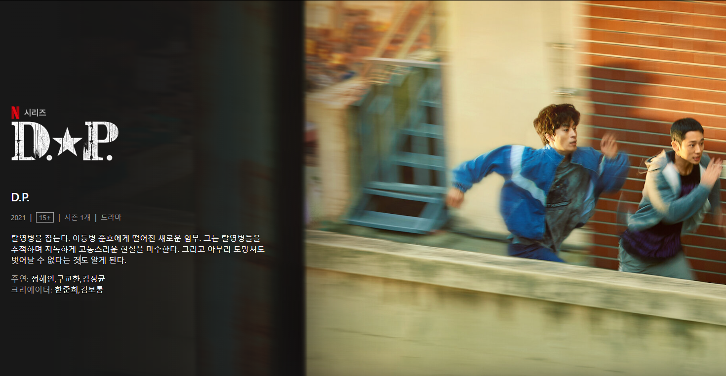 첫 번째 넷플릭스 추천 드라마는 군대를 배경으로 한 DP DP 시즌 1이다. DP 강아지의 날 웹툰을 원작으로 하는 넷플릭스 오리지널 드라마는 대한민국 육군 헌병대 참수부대의 탈영병 추적 및 검거를 주제로 제작됐다. 15년~20년 전 군복무를 한 30대 후반~40대라면 공감할 수 있는 영화로, 1997년 액션씬 못지않게 구교환과 정해인의 연기력이 돋보인다. 사이에도 영화의 재미가 더해지니 추천합니다.
