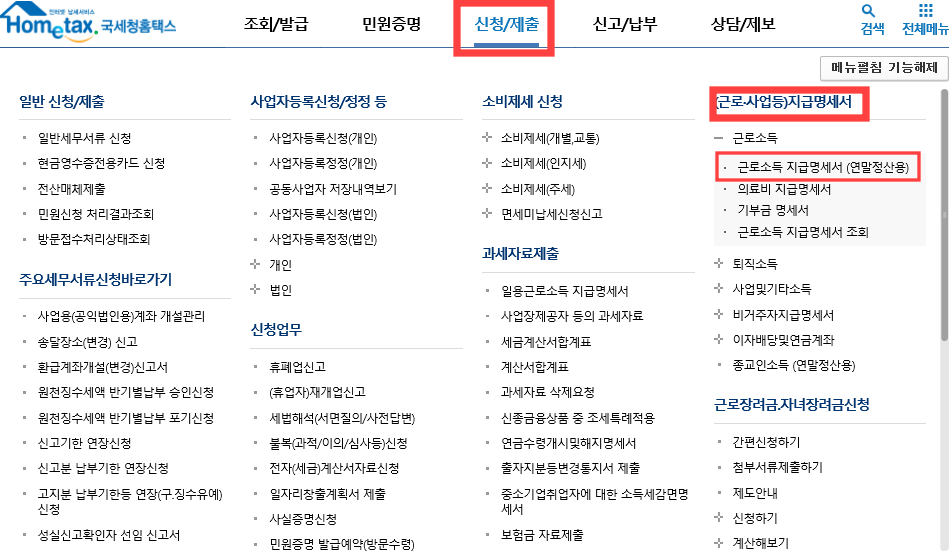 손쉬운 연말결산 바로가기 (공제자료조회/발급) 손쉬운 연말결산은 근로자가 송장대행기관에서 제출한 소득공제 및 세액공제(의료비, 보험료 등) 관련 자료를 제출할 수 있는 서비스입니다. 빠르고 쉬운 연말결산(공제신고서 작성 등) 바로가기 손쉬운 연말결산은 공제신고서 작성, 온라인 법인신고, 추정세액 산출, 맞벌이 소득공제 안내를 받을 수 있는 서비스입니다. . 원활한 홈택스(부가가치세 신고 등) 바로가기 부가세 신고, 사업장 실태신고, 전자세금계산서 등의 서비스를 이용하시려면 홈택스 바로가기를 이용하세요. 연말에… www.hometax.go.kr