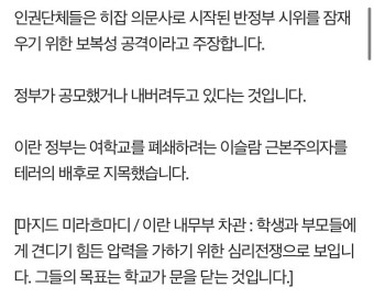 유세프 누리 이란 교육부 장관은 이날 국영TV에 출연해 “부모님의 우려를 충분히 이해하고 후속 조치를 진지하게 받아들이겠다”고 사과했다.