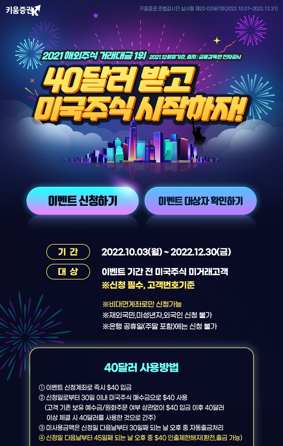 저는 해외주식투자 매매매체로 키움증권을 선택한 이유는 다양한 해외주식 추천을 보다 쉽게 찾아볼 수 있을 뿐만 아니라 키움증권의 히어로문G를 이용하여 다양한 매체주식 투자방법을 알려드릴 수 있기 때문입니다. . 이렇게 하시는 분들도 많고, 보고 따라하시면 쉽게 사용법을 익힐 수 있다는 장점이 있어서 키움증권을 이용하여 국내외 주식투자를 하고 있습니다. 기능 및 투자 콘텐츠 제공 ‘히어로문SG(MTS)’와 ‘히어로문G(HTS)’는 모바일 버전과 PC버전을 제공하며 사용자는 필요에 따라 원하는 거래 매체를 사용할 수 있다. 키움증권을 통해 중국본토, 홍콩, 일본, 독일, 영국, 인도네시아, 싱가폴, 프랑스, 이탈리아 등 총 10개국에서 거래할 수 있으며, 그 중 최근 인기 있는 미국주식도 많다. 단, 프랑스와 이탈리아에서는 오프라인 거래만 가능한지 확인 부탁드립니다. 해외주식 거래방법 문의시 가장 어려운 점은 거래시간이 다르다는 것입니다.일반적으로 서머타임에 따라 자유시장은 17:00-22:30, 일반시장은 22:30-05입니다. 또한, 시장전망에서는 한국 05:00-07:00 밤낮으로 거래되고 있어 재고 및 매수, 매도, 재고를 적시에 추적 및 관찰하기 어려울 수 있습니다. 퇴근 후 또는 야근 후 상황을 확인할 수 있지만 키움증권에서 제공하는 자동 모니터링 주문 서비스를 이용하시면 걱정 없이 이용하실 수 있습니다. 잠자는 동안 자동으로 주문합니다. 할 수 있기 때문에 편리함 그 자체라고 할 수 있습니다. 참고로 최대 90일 동안 사용자가 PC를 켜지 않아도 자동으로 주문이 실행됩니다. 또한 해외주식투자에서는 환율이 중요한 역할을 한다고 할 수 있으며, 키움증권도 목표환율 자동환전 서비스를 제공하여 고객이 목표환율이 되면 자동으로 외화를 사고 팔 수 있도록 하고 있습니다. 목표환율입니다. 도달했다. 해외주식의 경우 자동모니터링주문서비스 이용이 가능하고 원하는 환율에 도달하면 외화를 자동으로 사고팔 수 있는 편리함을 느끼고 만족도를 높인다. 해외주식투자를 잘하는 방법 중 하나는 증권사에서 활동을 통해 제공하는 혜택을 꼼꼼히 살펴보는 것인데요, 혜택부터 시작한다면 부담은 덜고 만족도는 높일 수 있을 것 같습니다. 작동하는지 확인하십시오. 키움증권 40위안 미국 주식 활동 시작 키움증권은 미국 주식을 제로 비용으로 시작할 수 있도록 40위안 미국 주식 활동을 시작합니다. 활동에 참여할 수 있는 대상은 활동 기간 중 가장 먼저 신규 고객 중 비대면 계좌를 개설한 고객입니다. 이렇게 받은 40달러는 신청일로부터 30일 이내에 미국 주식 매입가로 사용해야 하며 미사용 금액은 신청일로부터 30일 후 오후에 자동으로 출금된다. 신청일 이튿날 45일 오후에 입금한 40USD 출금한도가 해제되어 환전 및 출금이 가능한지 확인부탁드립니다. 키움증권 미국주식 활동 참여 시 유의사항도 확인하시기 바랍니다 은행 및 공휴일(주말 포함)에는 시민권자, 미성년자 및 외국인을 제외한 활동 신청이 불가합니다. 이번 활동은 앞서 언급한 바와 같이 기간 내 키움증권 해외주식 비대면계좌 개설 후 신청이다. 이벤트 기간 : 2022.04.01(금) ~ 2022.06.30(목) 입금 확인의 경우 이벤트 응모 완료 시 수신되는 문자를 확인하시고, 사용 매체에 따라 다음과 같이 확인해주세요. : 망번호(2111) ‘입금’ 또는 망번호(2110) ‘거래기록’ 누구나 쉽게 볼 수 있을 정도로 대중화되었다고 해도 과언이 아닙니다. 시작하기 전까지는 어렵게 느껴질 수 있지만 직접 해보시면 주식투자 경험자라면 누구나 할 수 있다고 생각합니다. 편리한 매매방법을 제공하는 매매매체를 선택하고, 부담을 줄이는데 도움이 되는 이벤트를 진행하는 증권사를 선택하는 것이 중요합니다. 이 모든 조건이 충족됨을 확인한 증권사는 키움증권입니다.해외주식 투자는 계획만이 아니라 직접 도전하는 지금부터 시작하시길 바라겠습니다. (MO로 이체) | (PC로 이체) (거래내역) * 2021년 외화증권 거래량 1위, 21일 말 기준 * 금융감독원 전자공시. 광고 시간(또는 기간)에 투자하면 미래가 같지 않을 수 있습니다. 해외 주식 거래는 외화증권 거래의 99.9%를 차지했다. *투자자는 금융투자상품에 대한 키움증권의 설명을 들을 권리가 있으며, 상품설명을 반드시 읽어보신 후 투자하시기 바랍니다. *해외 주식(집합투자증권) 거래는 자산가격 변동 및 환율 변동에 따라 투자원금 손실(0~100%)이 발생할 수 있으며 손실은 투자자에게 귀속됩니다. * 해외 주식(집합투자증권) 거래는 * 해외주식은 환율 변동에 따른 투자자산 변동으로 가치 손실이 발생할 수 있습니다. 레버리지 펀드의 주기적인 수익률은 추적하는 기초 자산(인덱스)의 일일 수익률과 다를 수 있습니다. : 0.5%), 세금 및 기타 비용이 있습니다. 0.00051% 미국 주식 매도 시 SEC수수료가 포함되어 있습니다. *기타 수수료는 당사 홈페이지를 참고하시기 바랍니다. (저는 이 글을 쓰기 위해 키움증권으로부터 로열티를 받았습니다.) 키움증권 준법감시인 시험 제22-01218호(저작권 수키파파 2013년 4월호. All rights reserved.