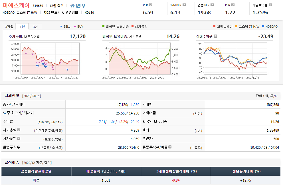 PSK의 현재 주가는 17,120원으로 전일 대비 -1,280원입니다. 피에스케이의 주주현황을 살펴보면 피에스케이홀딩스(기타 14개)가 32.84%의 지분을 보유하고 있다. 피에스케이는 장중 주가가 1만7120원인 반도체 및 관련 장비업체다. 삼성전자의 시가총액은 4945억원, 발행주식수는 1426주다. 외국인 참여는 567,368%, 일중 거래량은 28,966,714건을 기록했다. 매출 3,700억 원, 영업이익 941억 원을 달성했습니다. 주당순이익은 3,142원이며, PSK 주식의 배당수익률은 4,959%입니다.
